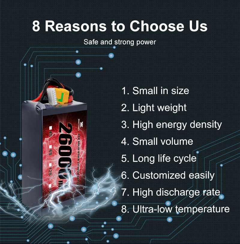 Questa batteria a stato solido è progettata per rivoluzionare l'esperienza dei droni. Con la sua alta densità di energia, è possibile ottenere tempi di volo prolungati e manovrabilità senza pari. Che tu sia un hobbista o un leader del settore, la nostra batteria da 16000 mAh è il compagno perfetto per le tue avventure aeree.