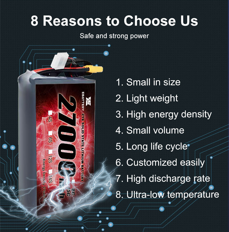 Oltre 10 anni di competenza: con oltre un decennio di esperienza nella produzione di batterie al litio, siamo leader del settore in soluzioni a batteria ad alte prestazioni, tra cuiConsegna rapida 27000Mah 27Ah 28000MAH28AH 6S 7S 12S 20S HV e batteria a stato di litio a stato solido ad alta densità.