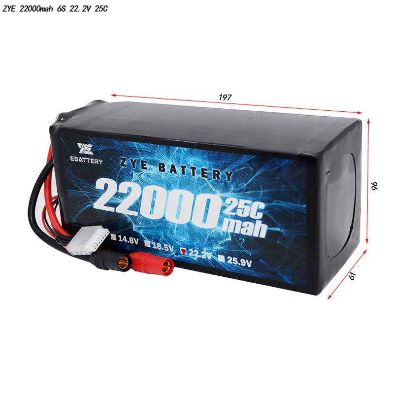 | 22000 mAh | 6s 25.2v | 22.2v | 488Wh | 200*91*63 | 2,54 kg | 264A (12c) | 550A (25C) |