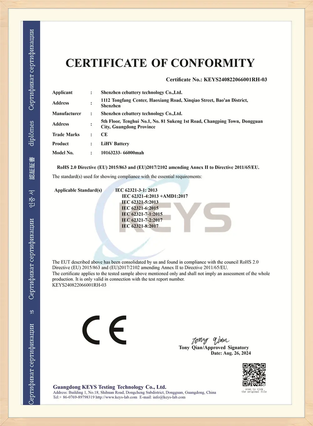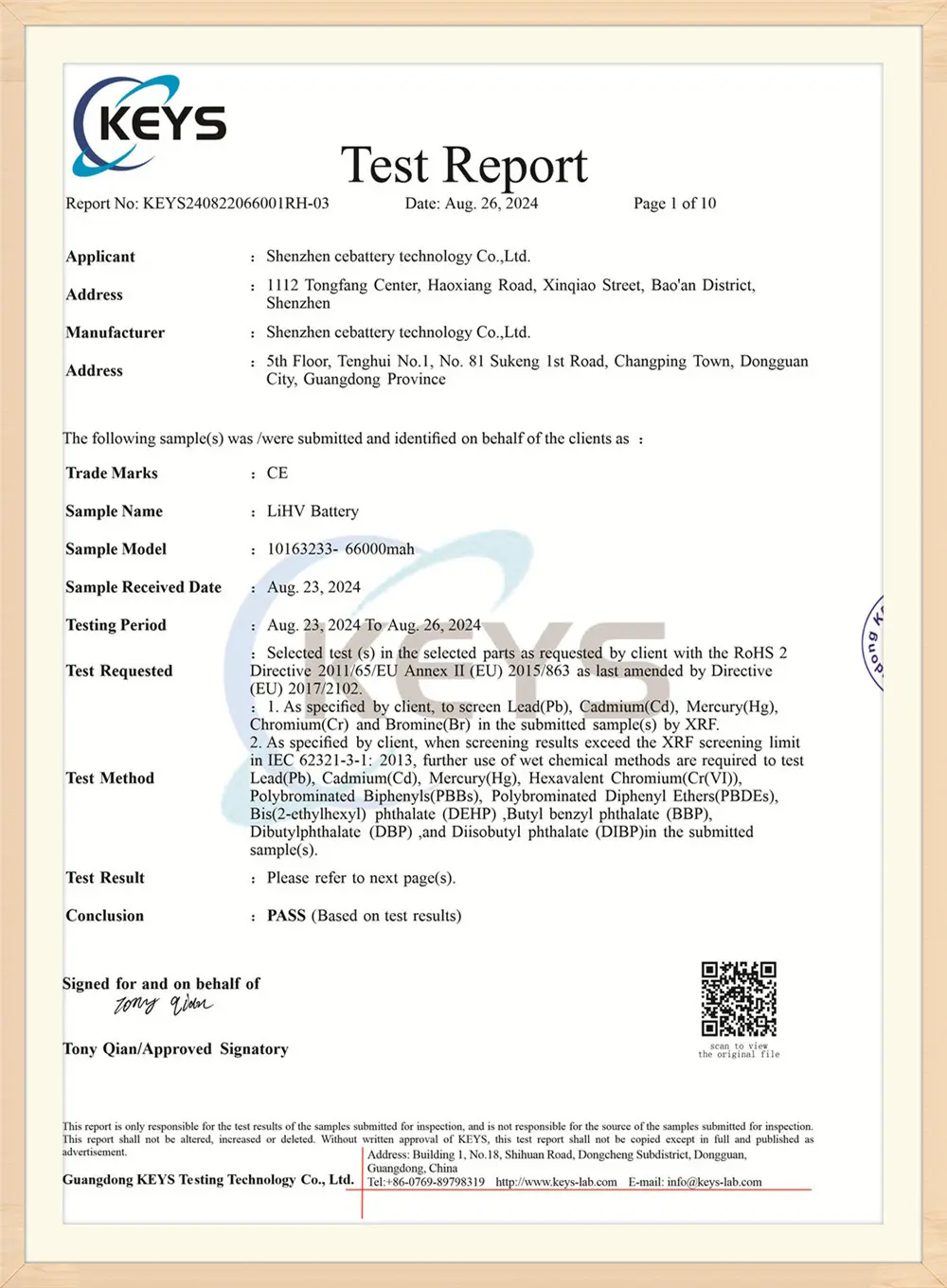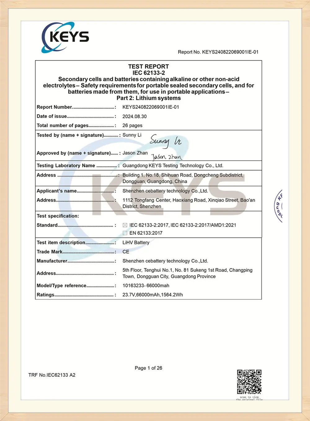 Zyebatteypersegue sempre la filosofia aziendale di "qualità prima, orientata al servizio, integrità che mantiene promesse". Per essere il miglior e più stabile fornitore di batterie, forniamo una tecnologia a batteria ricaricabile di alta qualità e Zyebattey ha superato molte certificazioni di autorità, come ISO9001: 2015, UL, CE, FCC, UN, 3C ecc.