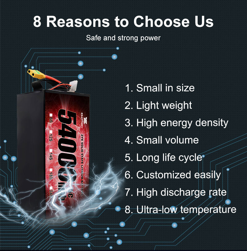 La nostra batteria allo stato solido LI HV 54000mAh 6S soddisfa gli standard più elevati del settore, con tecniche di produzione avanzate che garantiscono prestazioni e sicurezza eccezionali. Collabora con noi per elevare le tue soluzioni di alimentazione al livello successivo.